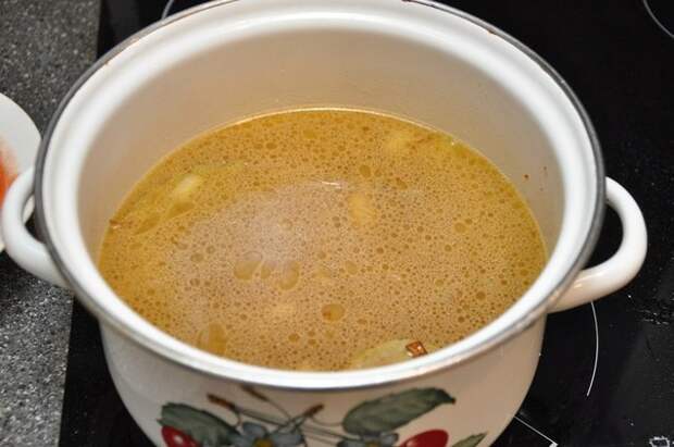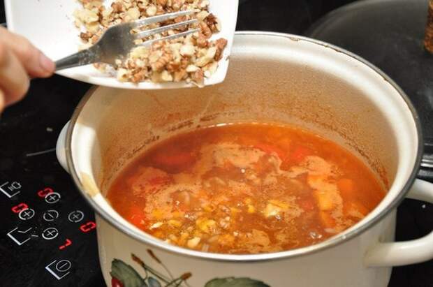 Выключить огонь. Готовому харчо дать настояться 20 минут. При подаче в каждую тарелку положить нарезанный колечками горький перец и измельченную зелень кинзы или петрушки.