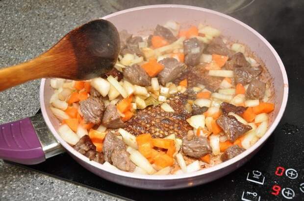 Переложить мясо с овощами в кастрюлю, залить холодной водой (2,5-3 л) посолить и варить на небольшом огне 30-45 минут (зависит от сорта мяса).