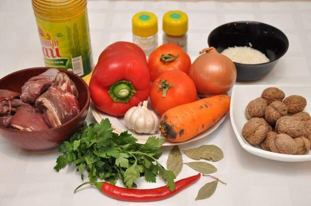 За пять минут до готовности риса положить орехи, а в самом конце добавить лавровый лист, раздавленный перец горошком и толченый чеснок.