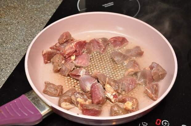 Мясо разрезать на порционные куски. Выложить в сковороду с разогретым маслом и обжарить на сильном огне около 10 минут.