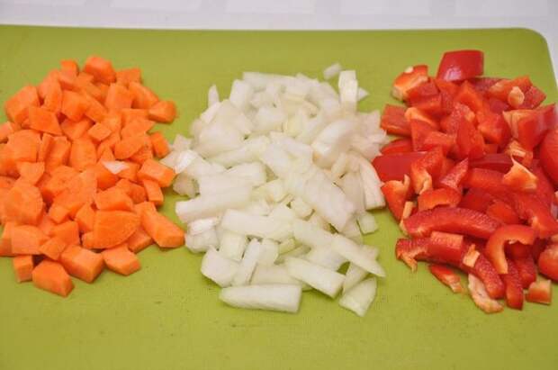 Помидоры натереть на терке, сладкий перец нарезать мелкими кубиками, и когда мясо хорошо разварится – положить в кастрюлю. Затем всыпать рис и варить до его готовности.