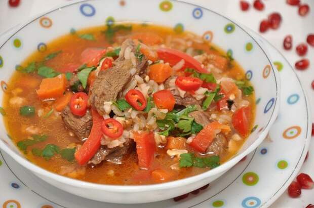 Харчо – грузинское первое блюдо, по густоте среднее между супом и рагу. Название переводится с грузинского языка как «говяжий суп», но его готовят с любым мясом – бараниной, курицей, уткой и пр. В его составе обязательно должен присутствовать рис, томаты или ткемали и совсем нет привычного нам картофеля.
