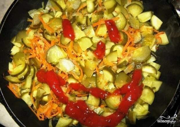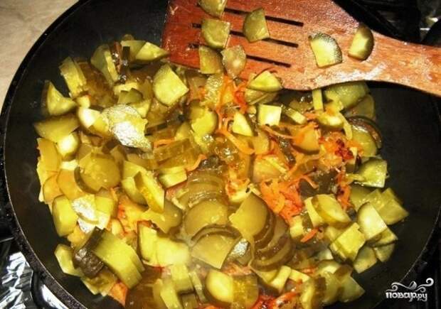 Когда лук зазолотится - добавляем в сковороду огурчики.