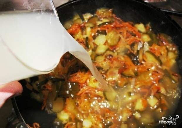 И, наконец, вливаем в сковороду немного рассола. Тушим.