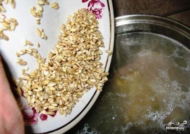 Когда бульон закипит - сбавляем огонь до минимума и варим еще 40 минут, после чего добавляем в кастрюлю перловку. Увеличиваем огонь до среднего, продолжаем варить.