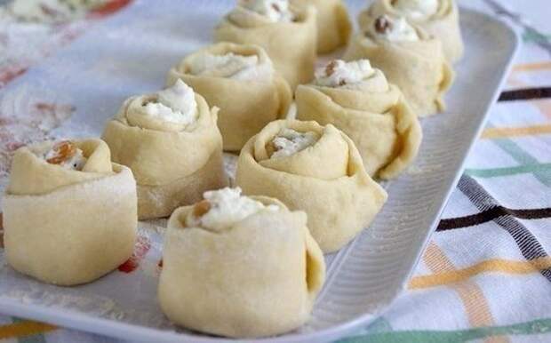 7. Одну из трёх частей (самую маленькую) оборачиваем вокруг творога и скрепляем.