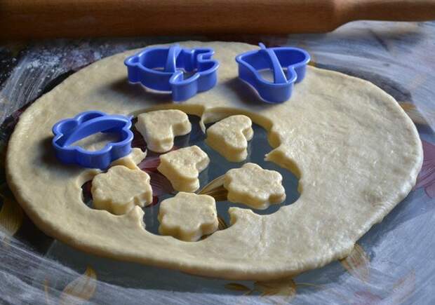 7. Рабочую поверхность присыпать мукой, раскатать тесто толщиной примерно 2 см. Формочками вырезать фигурки. Если формочек нет, сделайте как я — стаканом вырежьте кружки и сделайте надрезы с 4 сторон, не доходя до середины. В процессе жарки получатся цветочки.