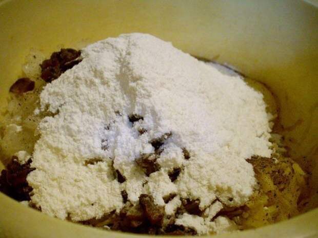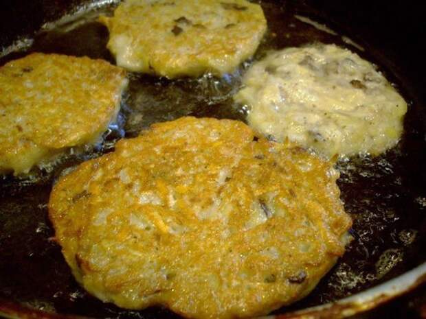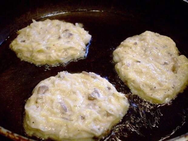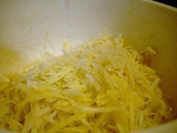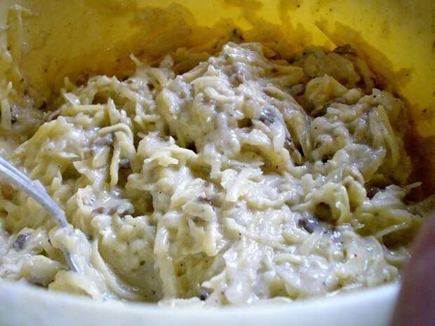 Собственно, главное в этом деле - картошка. Натираем ее на крупной терке. Аналогично поступаем с парой луковиц. Мелко режем грибы. И все вышеперечисленное соединяем в одной ёмкости. Солим. Перчим. Добавляем куриное яйцо и немного муки. И тщательно все смешиваем до консистенции густой сметаны.