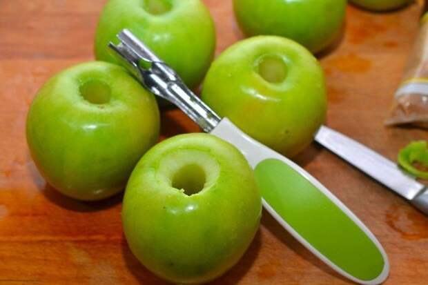 2. Нагрейте духовку до 200ᵒС. Хорошо помойте яблоки. Вырежьте сердцевину. Надрежьте или сделайте небольшие проколы кожицы по всей окружности яблока, чтобы она не лопнула при выпекании.