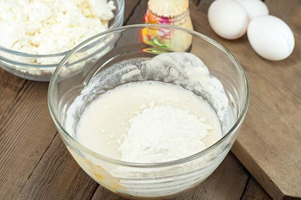 Для начала нам нужны тёпленькие кефир и сметанка. Смешиваем, разогреваем их и добавляем дрожжи, сахар, две столовые ложки муки. Размешиваем. Пусть постоит до образования пузырьков.