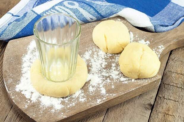 Начнём лепить ватрушки. Сухими руками отрываем от теста небольшие куски. Катаем из них шарики. С помощью стакана сделаем углубления.