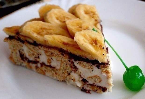 4. Украсить фруктами, полить желе для тортов (или обычным, разведенным в меньшем количестве воды, для лучшего застывания). Поставить в холодильник до полного застывания (лучше на ночь). Сметанный торт из крекера готов.