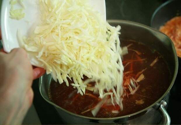 7. Теперь добавляем в наш "полу-борщ") остальные ингредиенты, такие как: картофель минут через 10 капусту и болгарский перец.