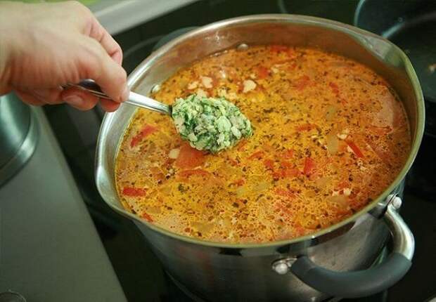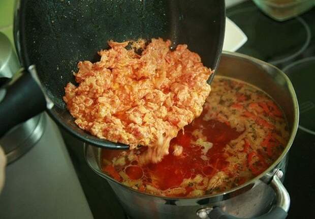 11. Пробуем картошку, если и она ничего, то все уже приготовилось. Пробуем бульон. На этом этапе Полтавский борщ нужно "настроить" как музыкальный инструмент. Если необходимо, можно добавить кислоты при помощи томатного сока, сделать слаще при помощи сахара, острее, солонее и т.д. и т.п. Приправы на основе несложных классических трав тоже приветствуются. Теперь фигачим туда зажарку из сковородки.