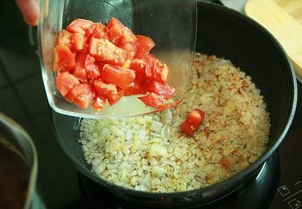 3. Тем временем начинаем готовить зажарку для Полтавского борща. На сковородку с подсолнечным маслом кладем мелко нарезанный лук и на маленьком огне обжариваем его до золотистого цвета, после чего добавляем в сковородку нарезанные помидоры немного обжариваем и затем добавляем две столовые ложки томатной пасты (делается по желанию для большей кислоты, можно заменить большим количеством свежих помидоров) и две-три столовые ложки сметаны.