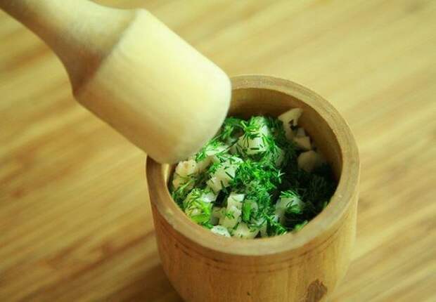 9. Теперь все три ингредиента заправки для Полтавского борща безжалостно давим, не хуже, чем мяту для мохито)), до однородной массы. Можно добавить щепотку крупной каменной или морской соли, она поможет тщательнее измельчить всё.