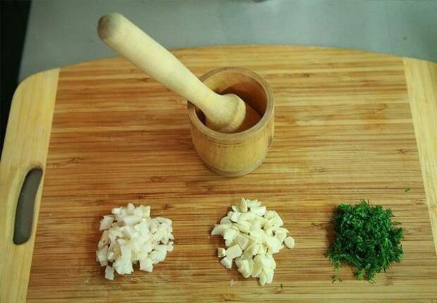 А именно: измельчаем немного укропа, два-три зубчика чеснока и немного старого сала, все нарезаем мелкими кусочками.