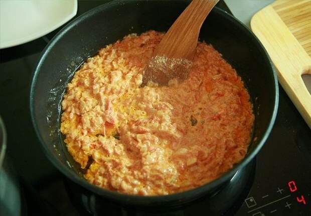 4. Все это тщательно смешиваем до однородного состояния и на маленьком огне оставляем кипеть, постоянно помешивая. Изюминка в том, что готовность зажарки определяется по слою полупрозрачного масла, выступившего на поверхности массы.