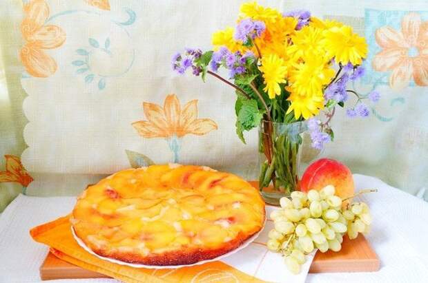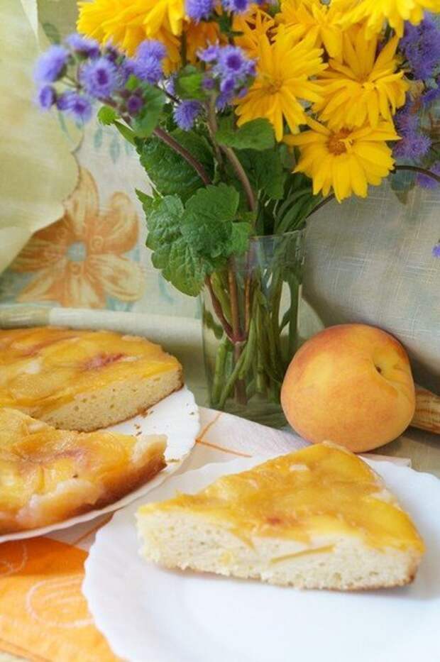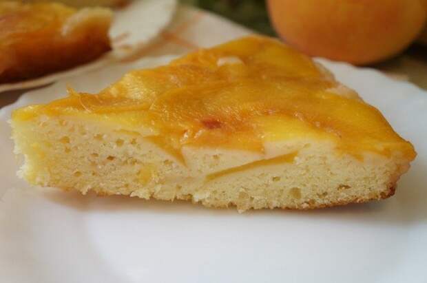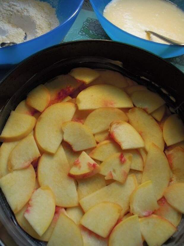 6. Разложить в форме ломтики персиков «внахлест» в 2–3 слоя. Выложить тесто на персики и отправить будущий пирог в предварительно разогретую духовку.