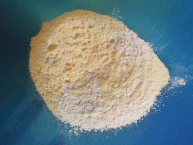 5. Отдельно смешать оба вида муки, разрыхлитель, соль, соду и ванилин. Всыпать мучную смесь в яично-сметанную. Тесто должно получится как на оладьи. При необходимости можно добавить немного муки.