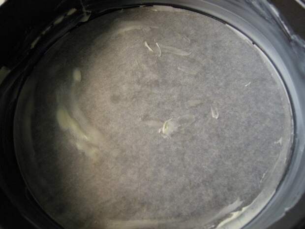 2. Форму застелить бумагой, хорошо смазать маслом, присыпать двумя ложками сахара.