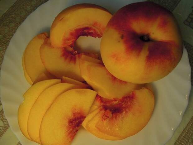 1. Персики необходимо помыть, убрать косточки и нарезать тонкими ломтиками.