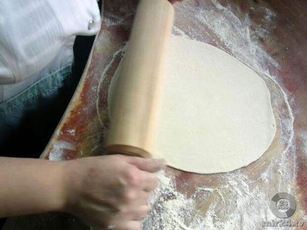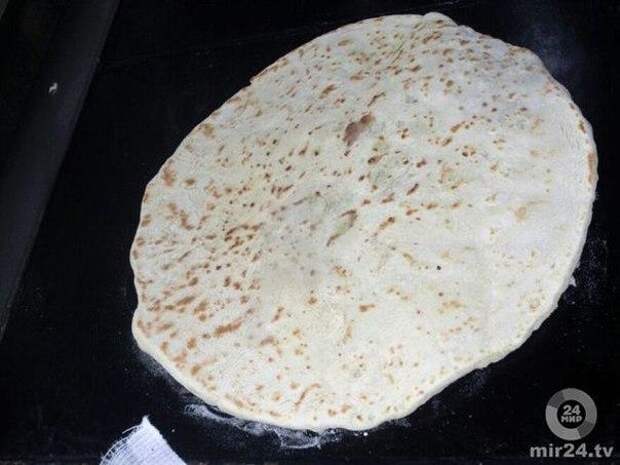 Начинку кладем на подготовленную лепешку из теста, собираем края, хорошо защипываем сверху, переворачиваем вниз швом. А дальше начинаются чудеса! Чуть приплюснув лепешку с начинкой пальцами, начинаем ее раскатывать скалкой в тонкий круглый блин, и он не рвется, а начинка остается внутри. Получаем буквально миллиметровой толщины большую лепешку, которую надо обжарить с двух сторон на раскаленной и смазанной маслом сковороде. для этого используется просто плоская жарочная поверхность плиты, либо специальная сковорода.