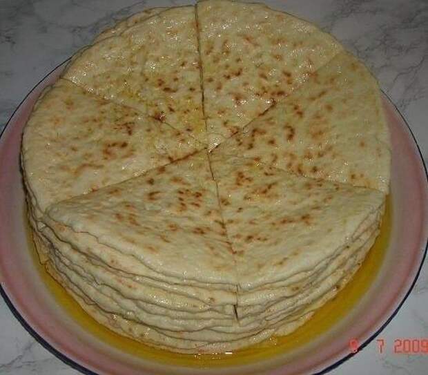 Это еще не все! Когда лепешки готовы, наливаем в большую плоскую ёмкость кипяток и ловко обмакивает каждую в воду. Теперь надо смазать их растопленным сливочным маслом с двух сторон, порезать и подавать на стол горячими.