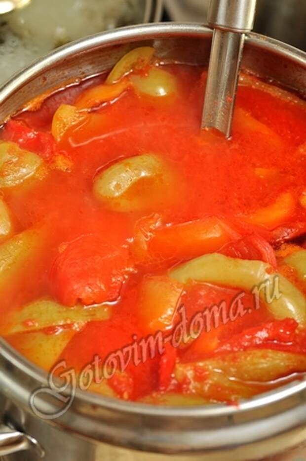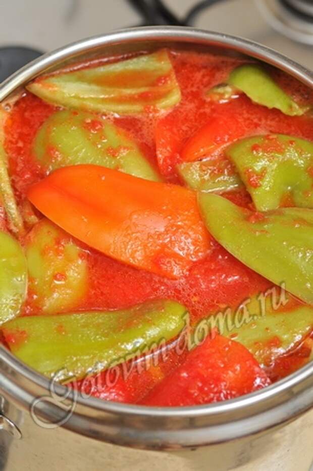 Довести томатный сок до кипения и добавить нарезанный перец.