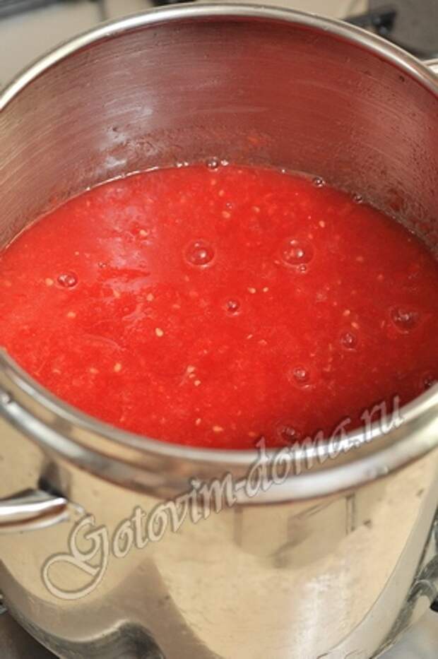 Прокрученную помидорную массу перелить в большую кастрюлю и добавить сахар, соль и масло.