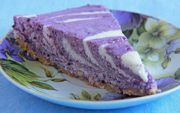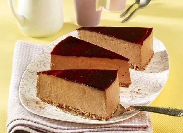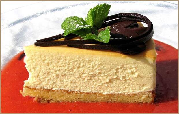 7. Готовый торт накрыть и поставить в холодильник на ночь. Подавать чизкейк с клубничным соусом.