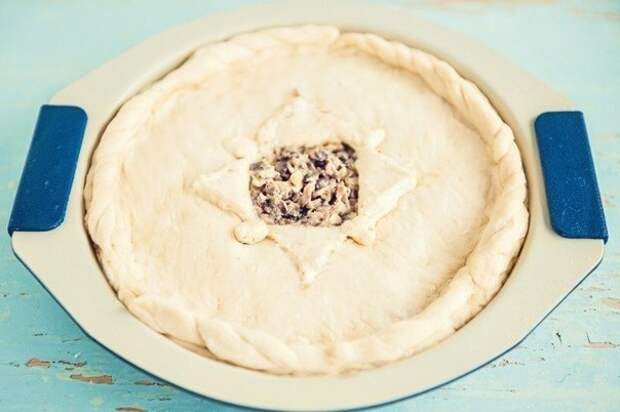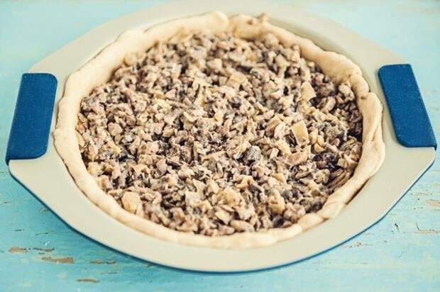 4. Разделить тесто на две неравные части: большая пойдет для нижней корочки пирога, меньшая – для верхней. Раскатать большую часть теста, выложить на дно смазанной формы для выпечки таким образом, чтобы края заходили на стенки, образуя бортики высотой около 2 см. Выложить ровным слоем начинку.