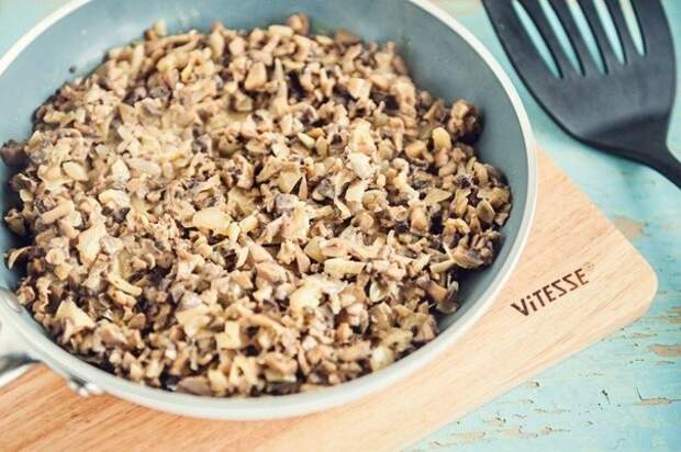3. По отдельности обжарить на сливочном масле измельченные грибы и мелко нарезанный лук, затем их соединить, посолить и добавить сметану. Тушить минут 10. В готовую начинку можно добавить нарезанную зелень.
