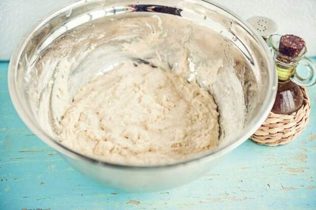 2. К быстродействующим дрожжам добавить воду, сахар, растительное масло, майонез, соль, муку, а также коньяк – он придаст тесту особый аромат. Замесить тесто, если оно получается жидким, добавить еще муки. Тесто должно подойти – подняться и увеличиться в размерах. Для этого нужно поставить его в теплое место и подождать. Можно поставить в духовку, установив температуру в 30 градусов – тогда тесто подойдет довольно быстро.