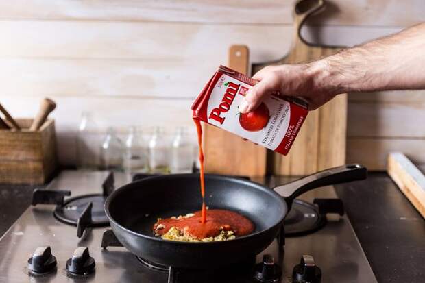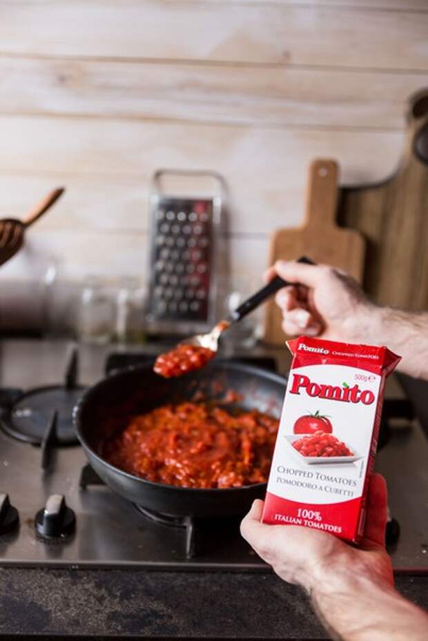 Добавьте протертые томаты и томаты кусочками, приправьте солью, орегано и перцем.