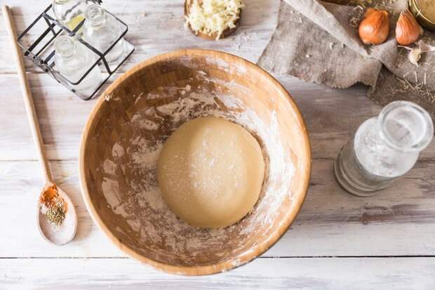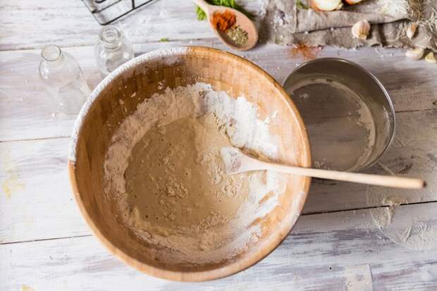 Добавьте постепенно муку, соль и замесите эластичное тесто.