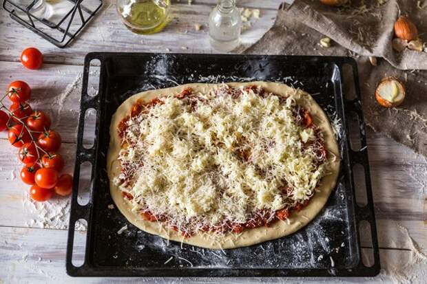 Смажьте соусом и распределите моцареллу.