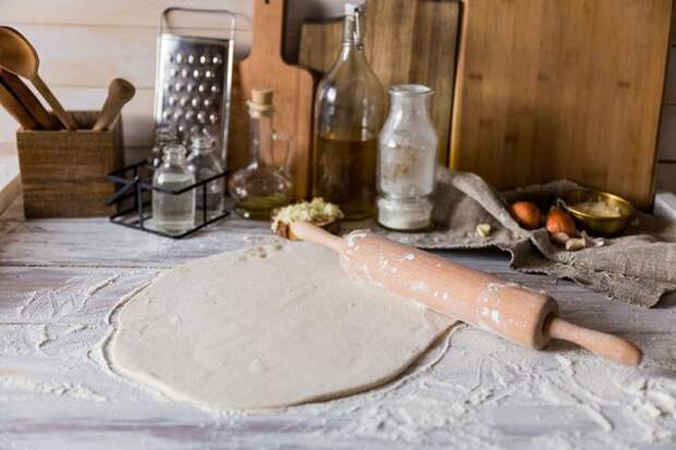 Раскатайте тесто в тонкий пласт диаметром 40–45 см.