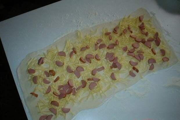 4. Высыпать сыр и сосиски, равномерно распределив по раскатанному тесту