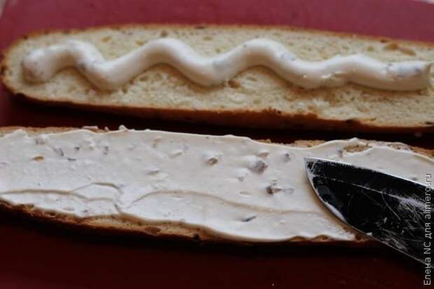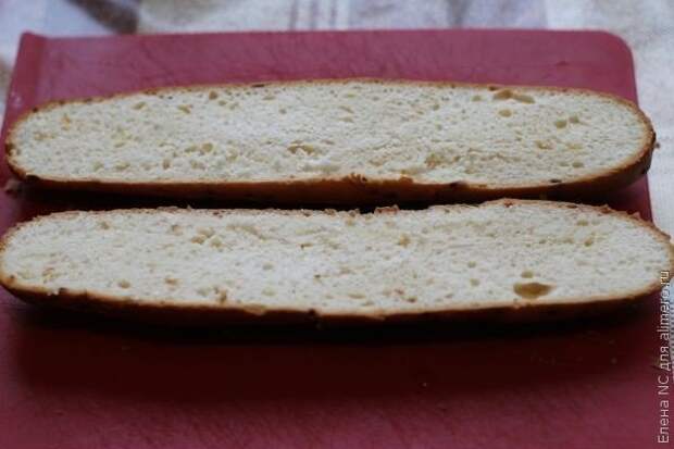 1. Разрезаем батончик вдоль на 2 части. Употребляю уменьшительно-ласкательный суффикс, чтобы обозначить, что не батон, а именно батончик.