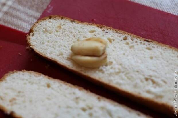 2. Натираем чесноком мякоть батона. Безусловно, можно взять любое хлебное изделие даже не первой свежести, но в таком случае на хлеб надо побрызгать водой и поставить в микроволновку на минуту.