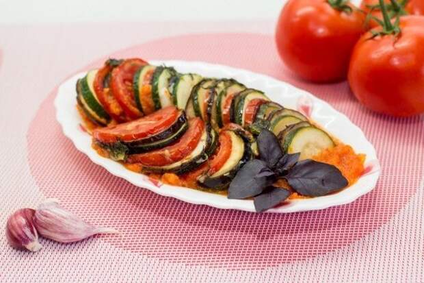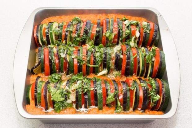 10. Чередуя, выложить в форму кружочки баклажанов, кабачков и помидоров.