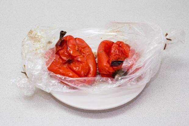 1. Первым делом необходимо запечь перцы для соуса. Для этого необходимо положить перцы в пакет для запекания и поставить в разогретую до 180 градусов духовку на 30—40 минут.