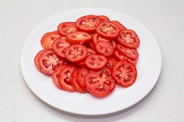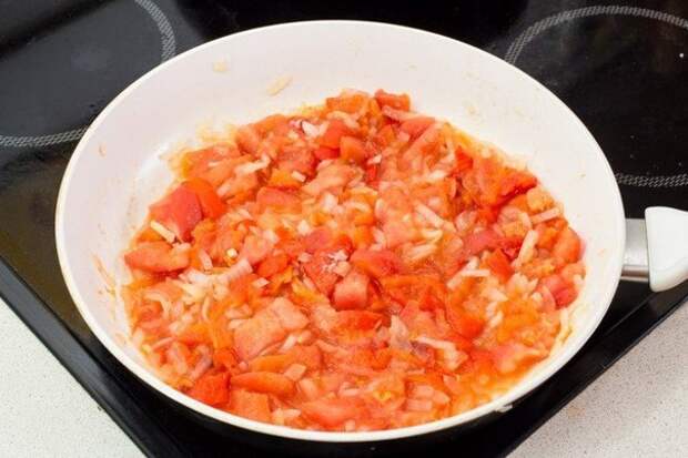6. С оставшихся помидоров необходимо снять кожицу. Для этого нужно сделать на помидорах крестообразный надрез и на несколько минут залить их кипятком. После этого кожица снимется очень легко. Помидоры нарезать кубиками и добавить в сковороду к луку.