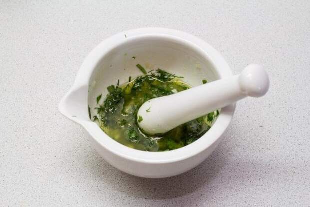 11. Отдельно растереть чеснок с солью, добавить оливковое масло, травы и специи по вкусу. Хорошенько все перемешать.