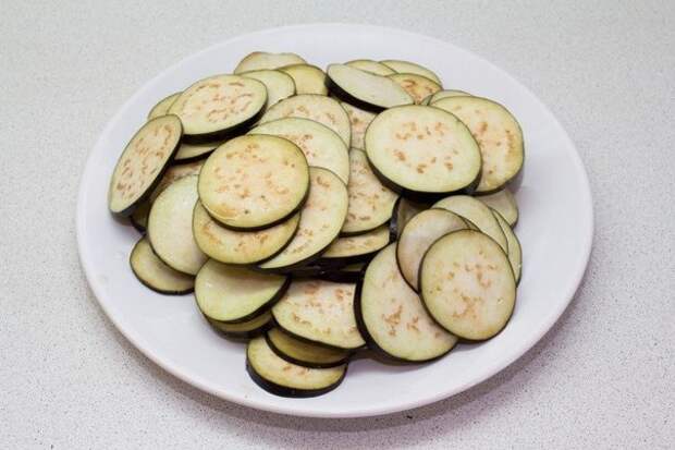 2. Нарезать кружочками баклажаны, посолить и оставить на 15—20 минут. Затем промыть их под холодной водой и подсушить на бумажном полотенце.
