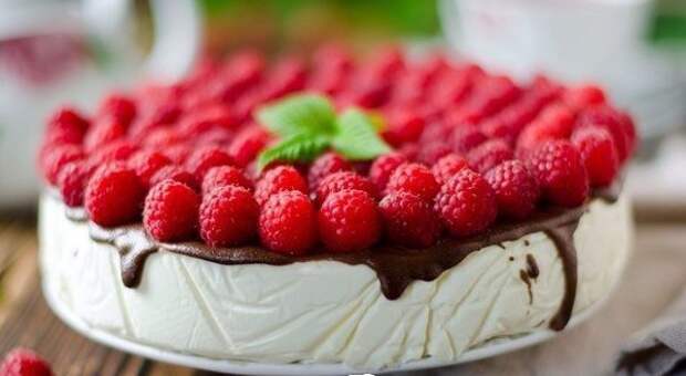 3. Смесь выложить на корж, убрать в холод. Когда суфле застынет сверху, малину взбить с оставшимися 150 г сахара, добавить оставшийся желатин, перемешать. Малину вылить поверх суфле. Убрать в холод на 4 часа для полного застывания.
