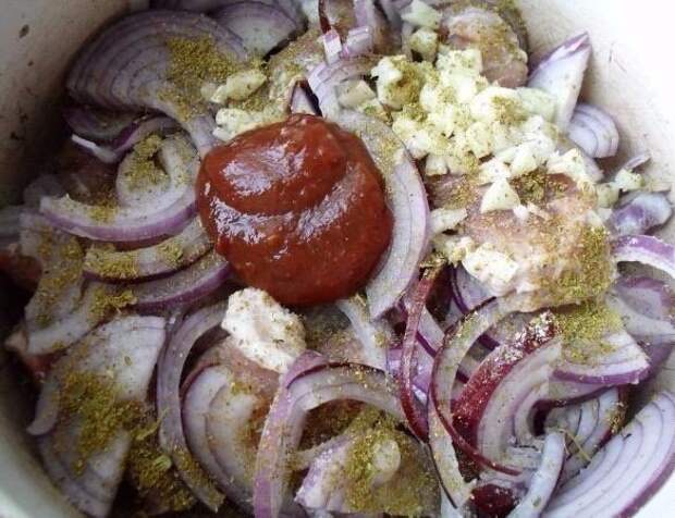 3. Мясо переложить луком, посыпать мелкорубленным чесноком, солью, перцем, хмели-сунели, добавить аджику.