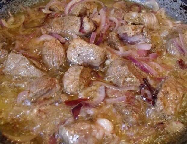 4. Тщательно перемешать и оставить мясо мариноваться на 30-40 минут. Затем обжарить кусочки мяса вместе с луком на растительном масле до румяной корочки.