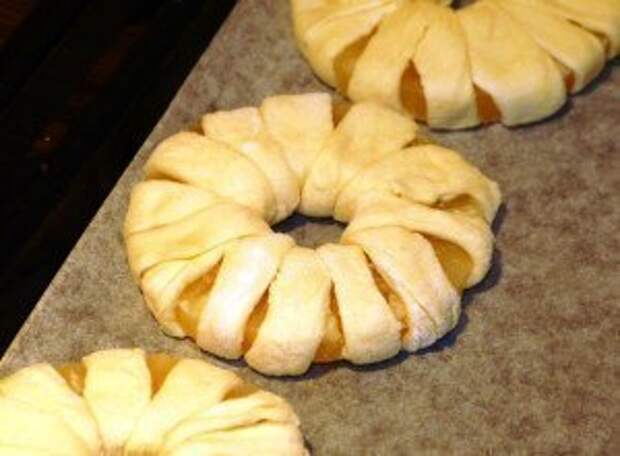 Если тесто слоеное дрожжевое — надо дать постоять с полчасика. У нас было слоеное пресное, поэтому не выстаивали. Выпекаем ананасы в тесте 20-30 мин. при температуре 180 гр.С.